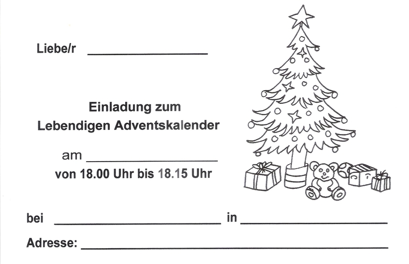 Nachstehend finden Sie die Einladungskärtchen des Lebendigen Adventskalender zum Download. Sie können sich gerne weitere Karten ausdrucken, falls Sie mehr benötigen. Die Karten sind für das Format A5 optimiert, sodass die Kinder die Bilder gut ausmalen können.